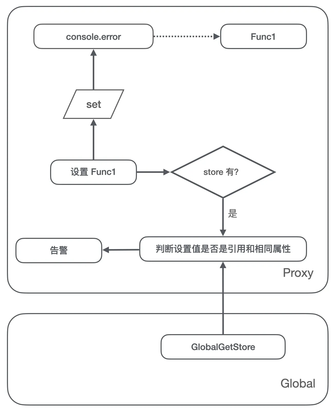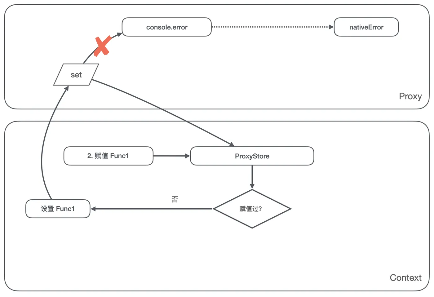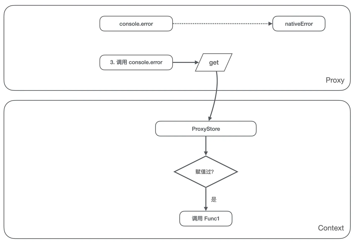 console.error赋值 Func1 的操作,我们判断 ProxyStore 里没有存储对这个属性的赋值,那么将 Func1 存储到 ProxyStore,这里注意我们不能将 Func1 设置到console.error上;