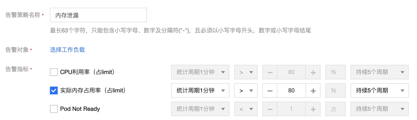 - 设置告警策略,在内存超限时告警,查看内存变化,确认是否泄漏;