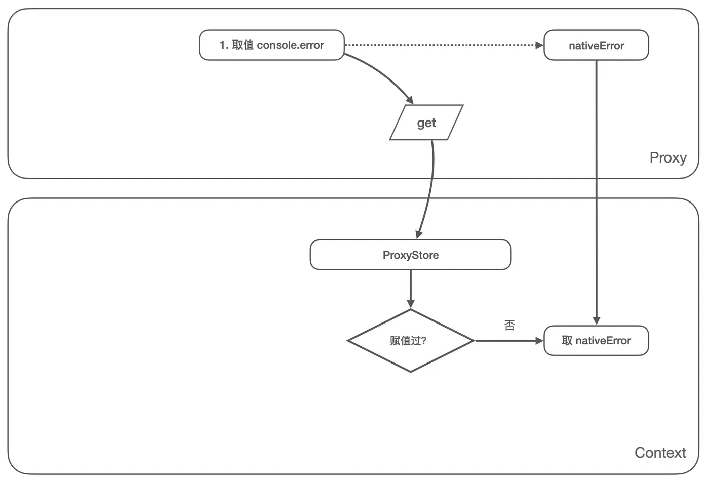 console.error的取值操作,我们判断 ProxyStore 里是否被当前环境设置过了,这时候没有,那么我们给取值操作返回原生的 error 方法;