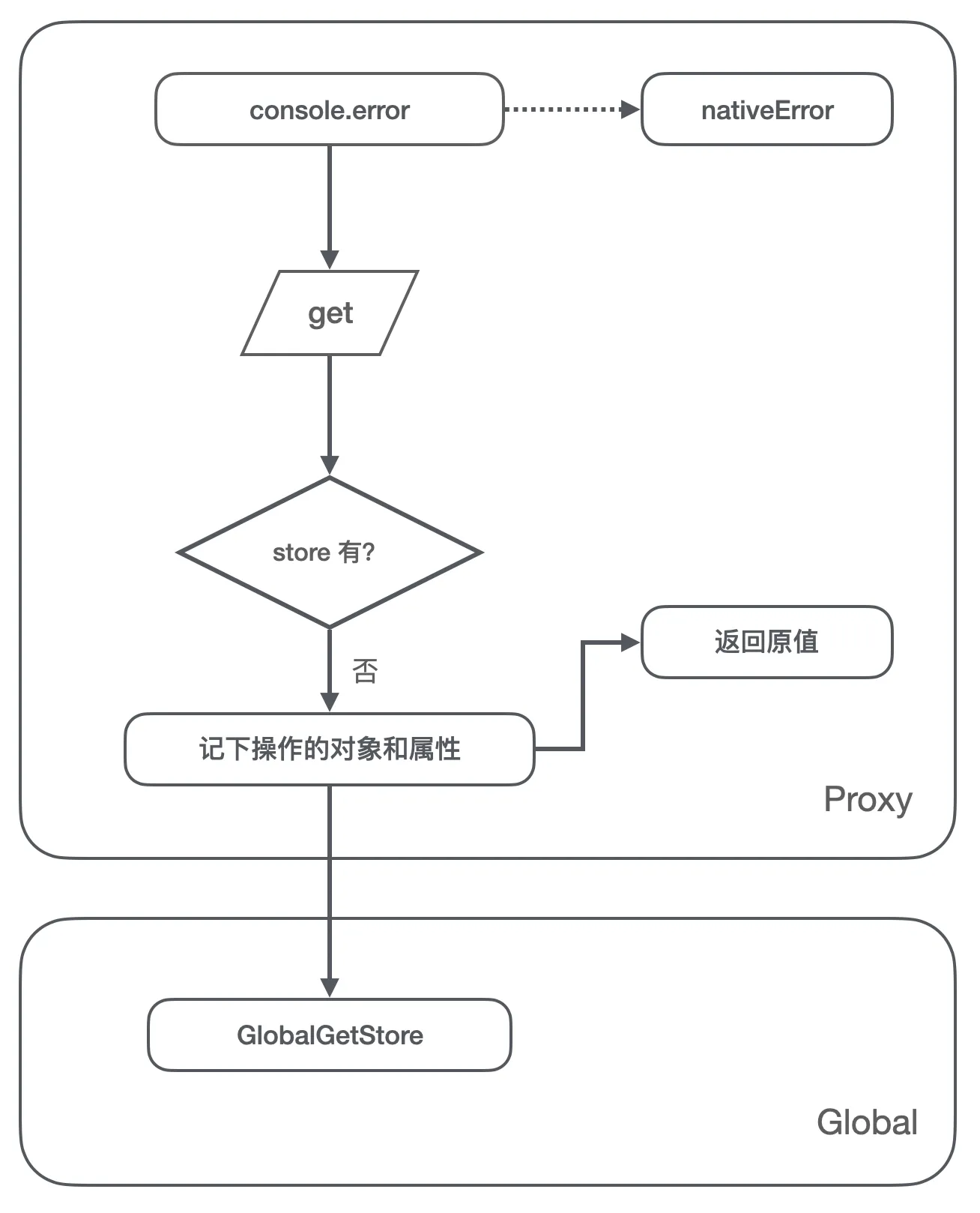 console.error指向原生的 error 方法; - 我们在全局设置个 GlobalGetStore 对象,用来记录被引用的对象和被引用的属性名;