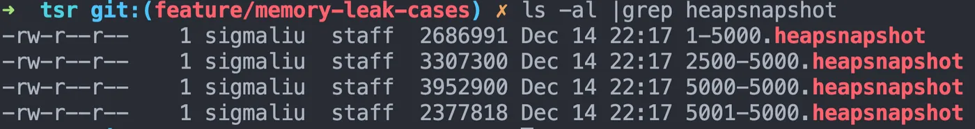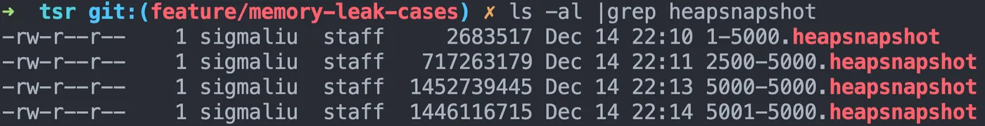 heapdump.writeSnapshot(`./${count}-${total}.heapsnapshot`);