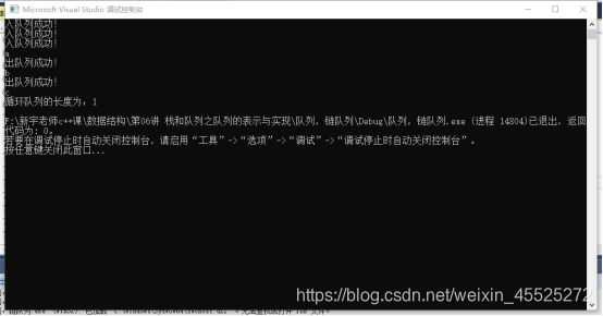 #include "pch.h" #include <iostream> using namespace std; //链队列 typedef struct qnode { char data; qnode *next; }*queueper; //头指针和尾指针 struct linkqueue { queueper front; //队列的尾指针 queueper rear; //队列的头指针 }; //初始化队列 int initlinkqueue(linkqueue &q) { //创建新节点设置为头,队尾队头志向该节点 q.front = q.rear = new qnode; q.rear->next = NULL;//头结点指针域设置为空 return 0; } //获取队列的头元素 char getqueueHead(linkqueue q) { if (q.front!=q.rear) { return q.front->next->data; } } //链队列入队列 int insertelem(linkqueue &q,char e) { queueper p; p = new qnode; p->data = e; p->next = NULL; q.rear->next = p; //将新节点插入到队列的尾部(后插法) q.rear = p; //尾指针指向尾结点 cout << "队列入队成功!" << endl; return 0; } //链队列出队列 int outputqueue(linkqueue &q, char &e) { queueper p; if (q.rear==q.front) { cout << "队列为空,无法出队列!" << endl; return 0; } p = q.front->next; //指向队头元素 e = p->data; //得到队头元素的数据域 q.front->next = p->next;//修改头指针 if (q.front==p) { q.rear = q.front; } delete p; cout << "出队列成功!" << endl; return 1; } int main() { linkqueue q; initlinkqueue(q); insertelem(q, 'a'); insertelem(q, 'b'); insertelem(q, 'c'); insertelem(q, 'd'); cout << "队列的头元素为:" << getqueueHead(q) << endl; char e = 'a'; outputqueue(q, e); cout << "队列的头元素为:" << getqueueHead(q) << endl; outputqueue(q, e); cout << "队列的头元素为:" << getqueueHead(q) << endl; return 0;