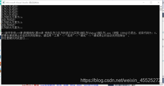 #include "pch.h" #include <iostream> using namespace std; #define MAXSIZE 5 struct SqQueue { char* Base; int front; int rear; }; //初始化循环队列 int initqueue(SqQueue &q) { q.Base = new char[MAXSIZE]; if (!q.Base) { cout << "内存空间分配失败!" << endl; return 0; } q.front = q.rear = 0; return 1; } //求循环队列的长度 int getqueuelength(SqQueue q) { return (q.rear - q.front + MAXSIZE) % MAXSIZE; } //求循环队列的头元素 char getqueuehead(SqQueue q) { return q.Base[q.front]; //q.front 是下标位置 } //循环队列的入队 int insertqueue(SqQueue &q, char e) { if ((q.rear+1)%MAXSIZE==q.front)//这样队列就满了 { cout << "队列已满,无法继续插入队列!" << endl; return 0; } q.Base[q.rear] = e; q.rear = (q.rear + 1) % MAXSIZE; cout << "入队列成功!" << endl; return 1; } //循环队列的出队列 int outputqueue(SqQueue &q, char e) { if (q.rear==q.front) { cout << "队列为空,无法出队列!" << endl; return 0; } e=q.Base[q.front]; q.front = (q.front + 1) % MAXSIZE; cout << "出队列成功!" << endl; return 1; } int main() { SqQueue q; initqueue(q); insertqueue(q, 'a'); insertqueue(q, 'b'); insertqueue(q, 'c'); cout << getqueuehead(q) << endl;; char c='a'; outputqueue(q,c); cout << getqueuehead(q) << endl; outputqueue(q, c); cout << getqueuehead(q) << endl; cout << "循环队列的长度为:" << getqueuelength(q) << endl; return 0; }