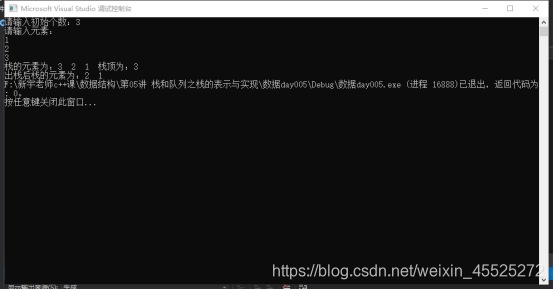 #include "pch.h" #include <iostream> #include<Windows.h> #include<string> using namespace std; #define OK 1 #define ERROR 0 #define OVER -2 #define MAXSIZE 100 typedef int Status; //返回状态 //顺序表结构体 struct SqStack { char *base; char *top; int StackSize; }; //初始化顺序栈 Status InitStack(SqStack &S) { S.base = new char[MAXSIZE]; if (!S.base) { Sleep(3000); exit(OVER); } S.top = S.base; S.StackSize = MAXSIZE; return OK; } //入栈 Status Push(SqStack &s, char &e) { if (s.top - s.base == s.StackSize) { return ERROR; } *(s.top) = e; //元素入栈,栈顶指针+1 s.top++; return OK; } //出栈 Status Pop(SqStack &s, char &e) { if (s.base == s.top) { return ERROR; } e = *(s.top - 1); //这是出栈元素 s.top--; return OK; } //得到栈顶元素 char GetTop(SqStack &s) { if (s.top != s.base) { return *(s.top - 1); } } //打印栈元素 void PrintStack(SqStack &s) { if (s.top != s.base) { cout << "栈的元素为:"; int k = 0; for (int i = (s.top - s.base); i > 0; i--) { cout << *(s.top - 1) << " "; --s.top; k++; } for (int j = 0; j <k; j++) { ++s.top; } } } int main() { SqStack s; InitStack(s); int n; cout << "请输入初始个数:"; cin >> n; cout << "请输入元素:" << endl; for (int i = 0; i < n; i++) { char p; cin >> p; Push(s, p); } PrintStack(s); cout << "栈顶为:" << GetTop(s) << endl; char p1; Pop(s, p1); cout << "出栈后"; PrintStack(s); return 0; }