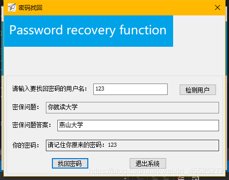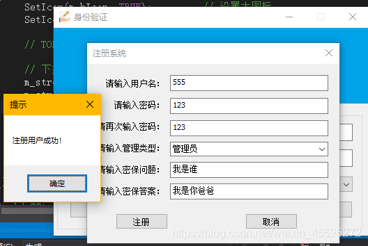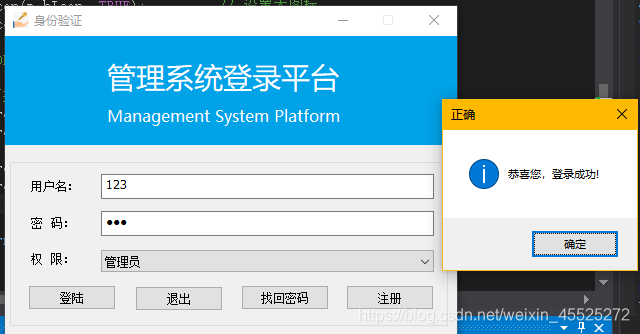 void CStudentDlg::OnBnClickedButtonlogo() { // TODO: 在此添加控件通知处理程序代码 CADOConnect adoConn; CString str, sqlstr; int iCleck; iCleck = ((CComboBox*)GetDlgItem(IDC_COMBOCLECK))->GetCurSel(); ((CComboBox*)GetDlgItem(IDC_COMBOCLECK))->GetLBText(iCleck, str); //AfxMessageBox(str); UpdateData(TRUE); if (m_strname.IsEmpty() || m_strpassword.IsEmpty()) { MessageBox(L"对不起:用户名或密码不能为空?", L"错误", MB_ICONERROR); GetDlgItem(IDC_EDITUSER)->SetFocus(); // 将光标跳到输入用户名编辑框控件 } GetDlgItem(IDC_EDITUSER)->SetFocus(); try{ sqlstr.Format(L"select *from UserTables where strname = '%s' and strpassword = '%s' and strcleck = '%s'", m_strname, m_strpassword, str); _bstr_t vSQL; vSQL = (_bstr_t)sqlstr; _RecordsetPtr m_recordSet; m_recordSet = adoConn.GetRecordSet(vSQL); CString str1, str2, str3; str1 = (LPCSTR)(_bstr_t)(m_recordSet->GetCollect("strname")); str2 = (LPCSTR)(_bstr_t)(m_recordSet->GetCollect("strpassword")); str3 = (LPCSTR)(_bstr_t)(m_recordSet->GetCollect("strcleck")); // 删除字符串右空格 str1.TrimRight(); str2.TrimRight(); str3.TrimRight(); if (str1 == m_strname || str2 == m_strpassword || str3 == str) { MessageBox(L"恭喜您,登录成功!", L"正确", MB_ICONINFORMATION); this->EndDialog(TRUE); } } catch (...) { MessageBox(L"对不起:操作失败?", L"错误", MB_ICONERROR); m_strname = L""; m_strpassword = L""; GetDlgItem(IDC_EDITUSER)->SetFocus(); UpdateData(false); } }