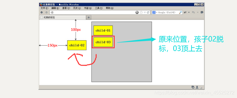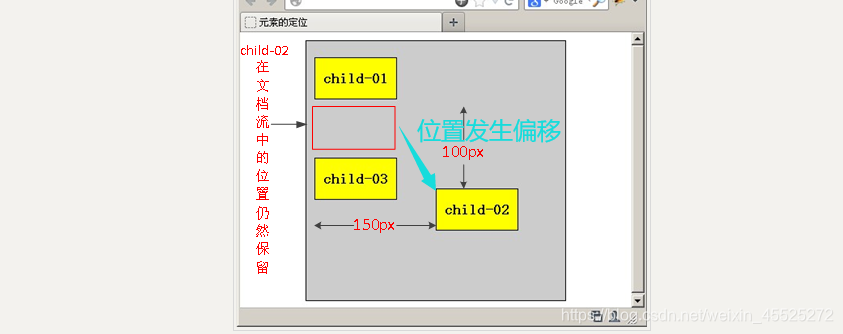 对元素设置相对定位后,可以通过边偏移属性改变元素的位置,但是它在文档流中的位置仍然保留(保留原来所占位置)。如下图所示,即是一个相对定位的效果展示: