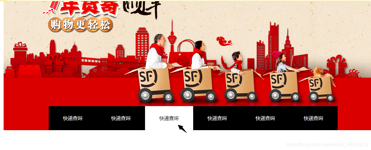 <!DOCTYPE html> <html lang="en"> <head> <meta charset="UTF-8"> <title>Document</title> <style> * { margin: 0; padding: 0; } .sf { width: 1259px; height: 472px; margin: 100px auto; position: relative; } .nav { width: 960px; height: 80px; background-color: #000; position: absolute; bottom: 0; left: 50%; margin-left: -480px; } .nav li { list-style-type: none; width: 160px; height: 80px; float: left; } .nav li a { width: 160px; height: 80px; display: block; text-align: center; line-height: 80px; color: #fff; text-decoration: none; } .nav li a:hover { color: #000; background-color: #fff; } </style> </head> <body> <div class="sf"> <a href="#"> <img src="images/sf.png" alt="" height="472" width="1259"> </a> <div class="nav"> <ul> <li><a href="#">快递查询</a></li> <li><a href="#">快递查询</a></li> <li><a href="#">快递查询</a></li> <li><a href="#">快递查询</a></li> <li><a href="#">快递查询</a></li> <li><a href="#">快递查询</a></li> </ul> </div> </div> </body> </html>
