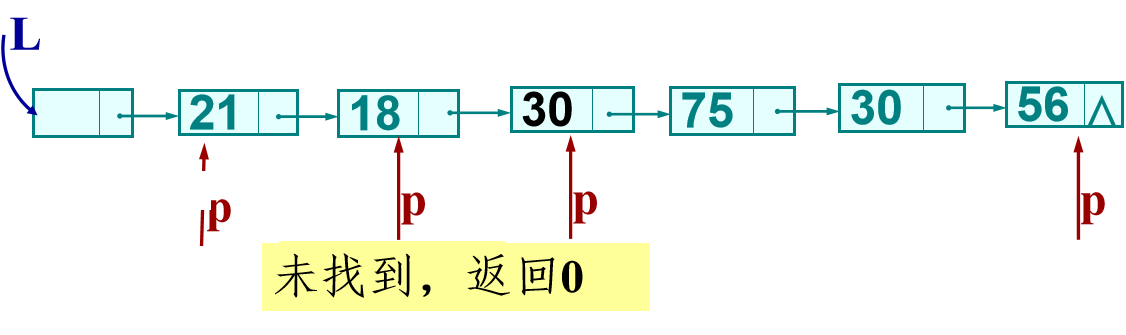 - 如果查遍整个链表都没有找到其值和e相等的元素,则返回0或“NULL”。.