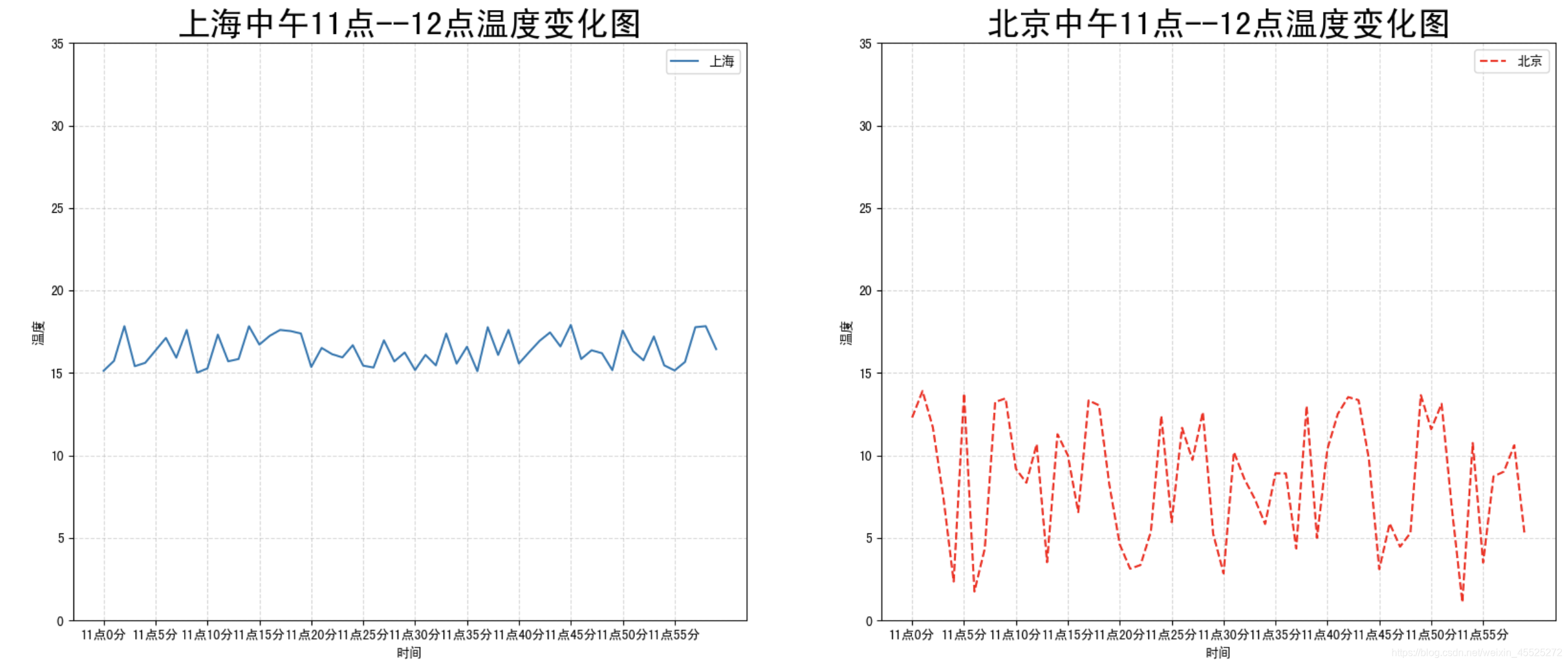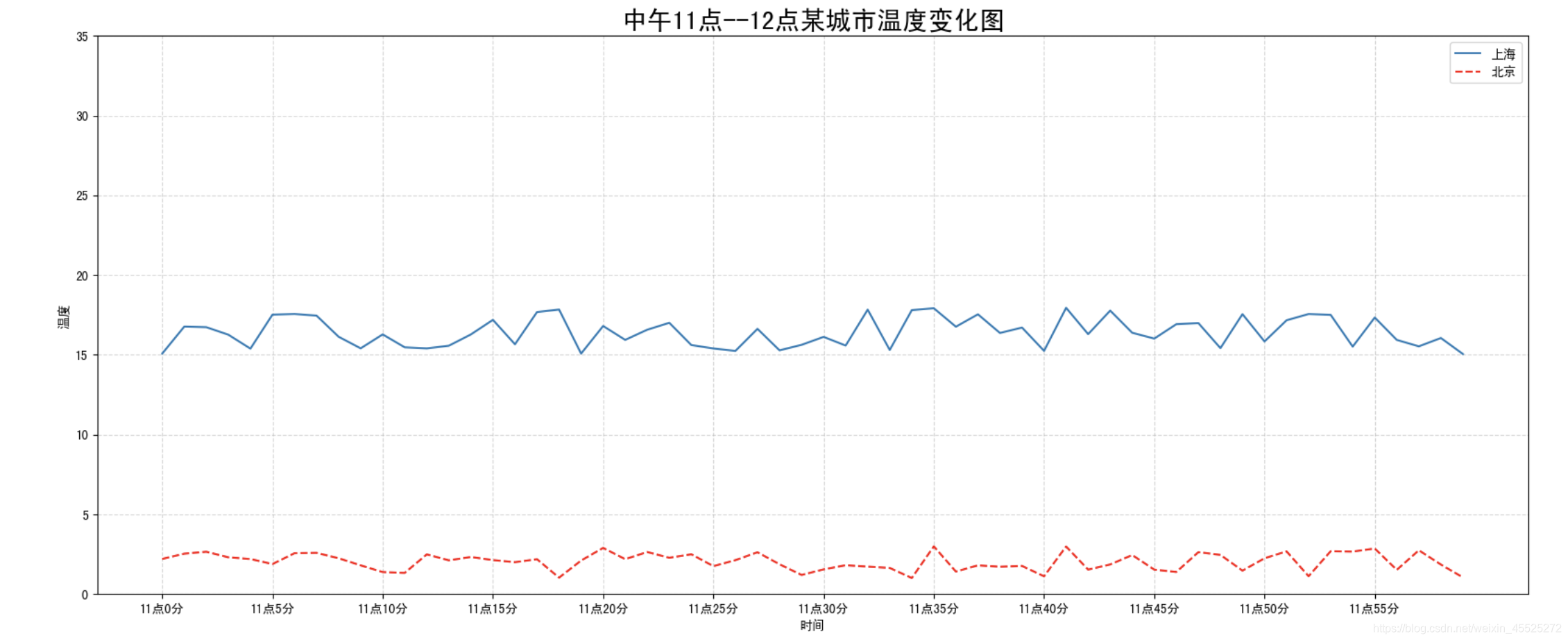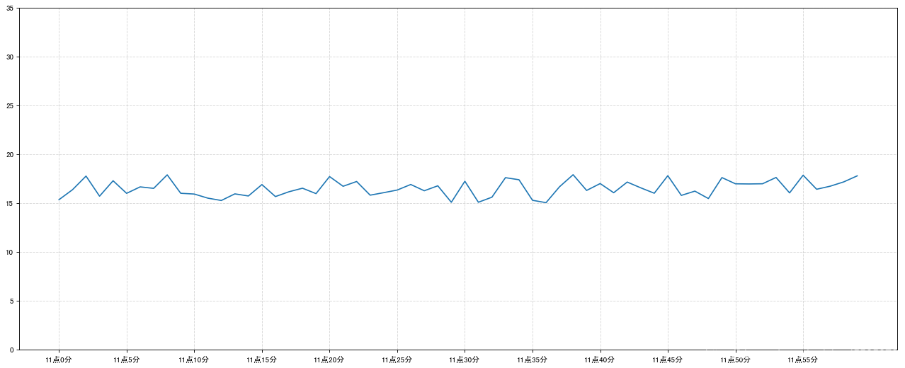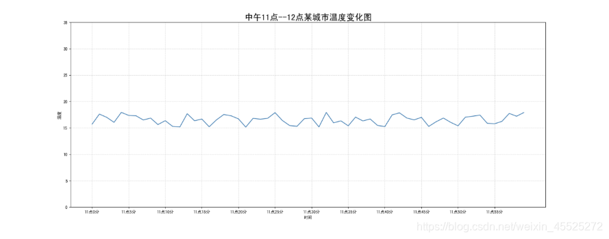 需求:画出某城市11点到12点1小时内每分钟的温度变化折线图,温度范围在15度~18度