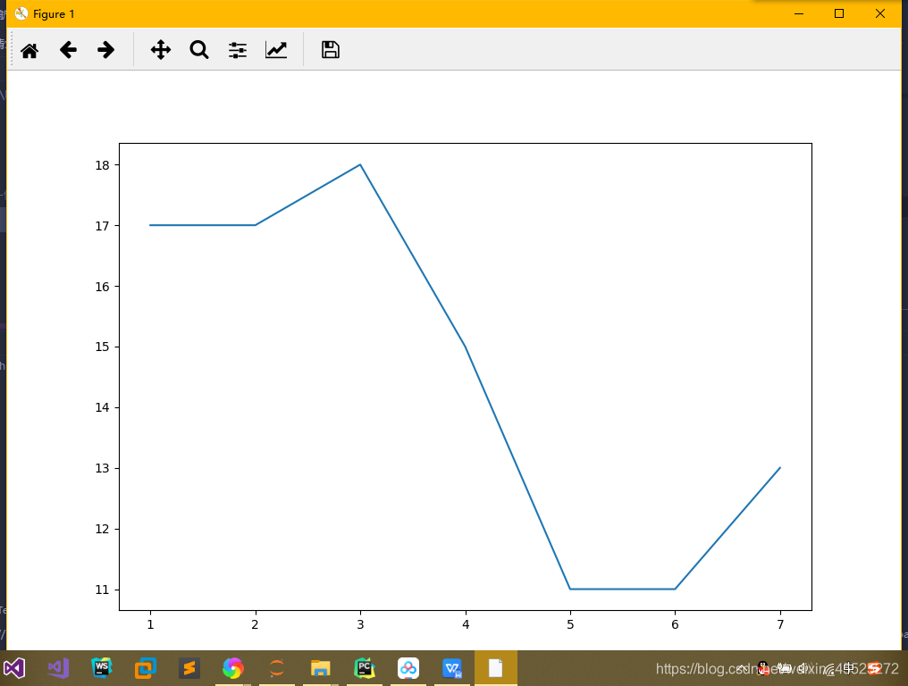 import matplotlib.pyplot as plt # 1.创建画布 plt.figure(figsize=(10, 10), dpi=100) # 2.绘制折线图 plt.plot([1, 2, 3, 4, 5, 6 ,7], [17,17,18,15,11,11,13]) # 3.显示图像 plt.show()