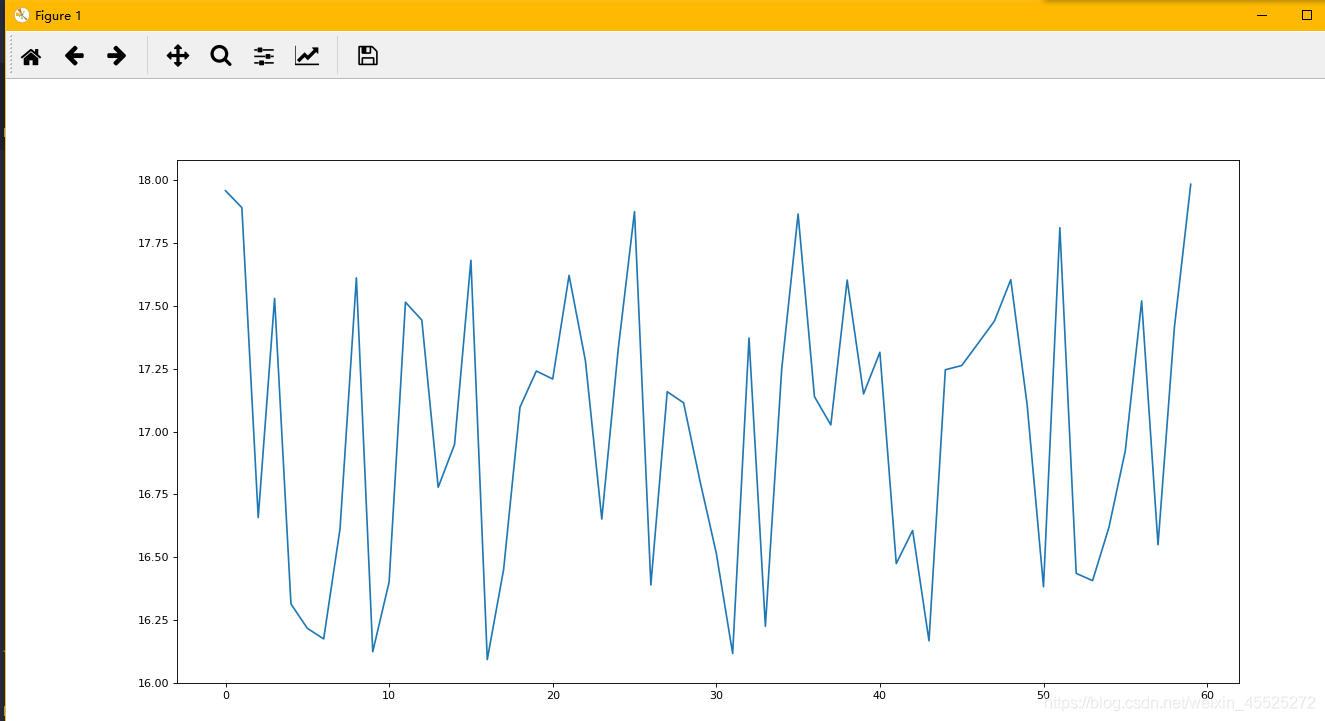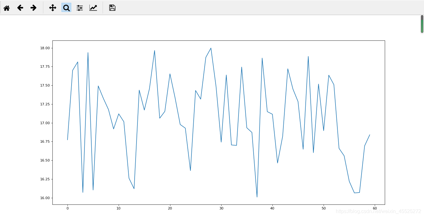 import matplotlib.pyplot as plt import random # 画出温度变化图 # 0.准备x, y坐标的数据 x = range(60) y_shanghai = [random.uniform(15, 18) for i in x] # 1.创建画布 plt.figure(figsize=(20, 8), dpi=80) # 2.绘制折线图 plt.plot(x, y_shanghai) # 3.显示图像 plt.show()