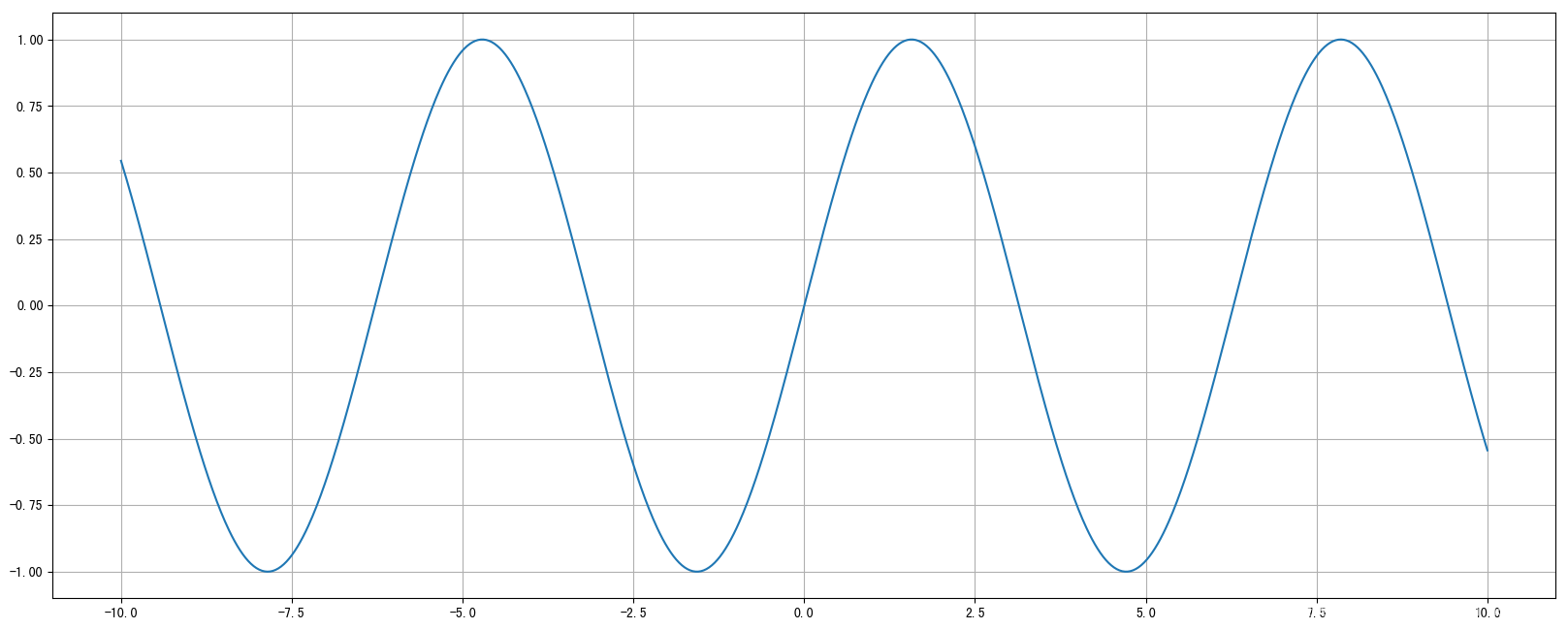 import numpy as np # 0.准备数据 x = np.linspace(-10, 10, 1000) y = np.sin(x) # 1.创建画布 plt.figure(figsize=(20, 8), dpi=100) # 2.绘制函数图像 plt.plot(x, y) # 2.1 添加网格显示 plt.grid() # 3.显示图像 plt.show()