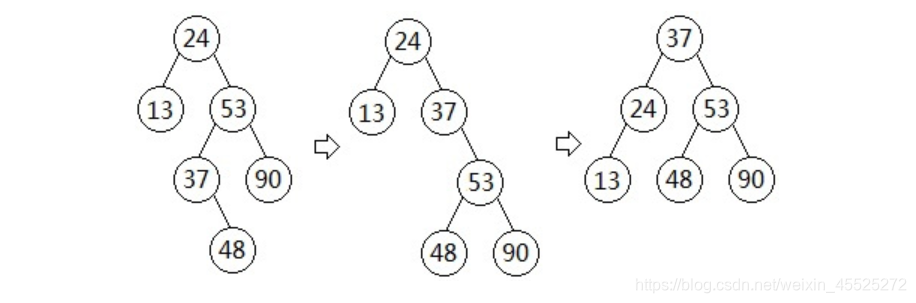 - 右单旋转:以37为轴,53顺时针旋转(向下),原本是37左孩子的48成为53的左孩子