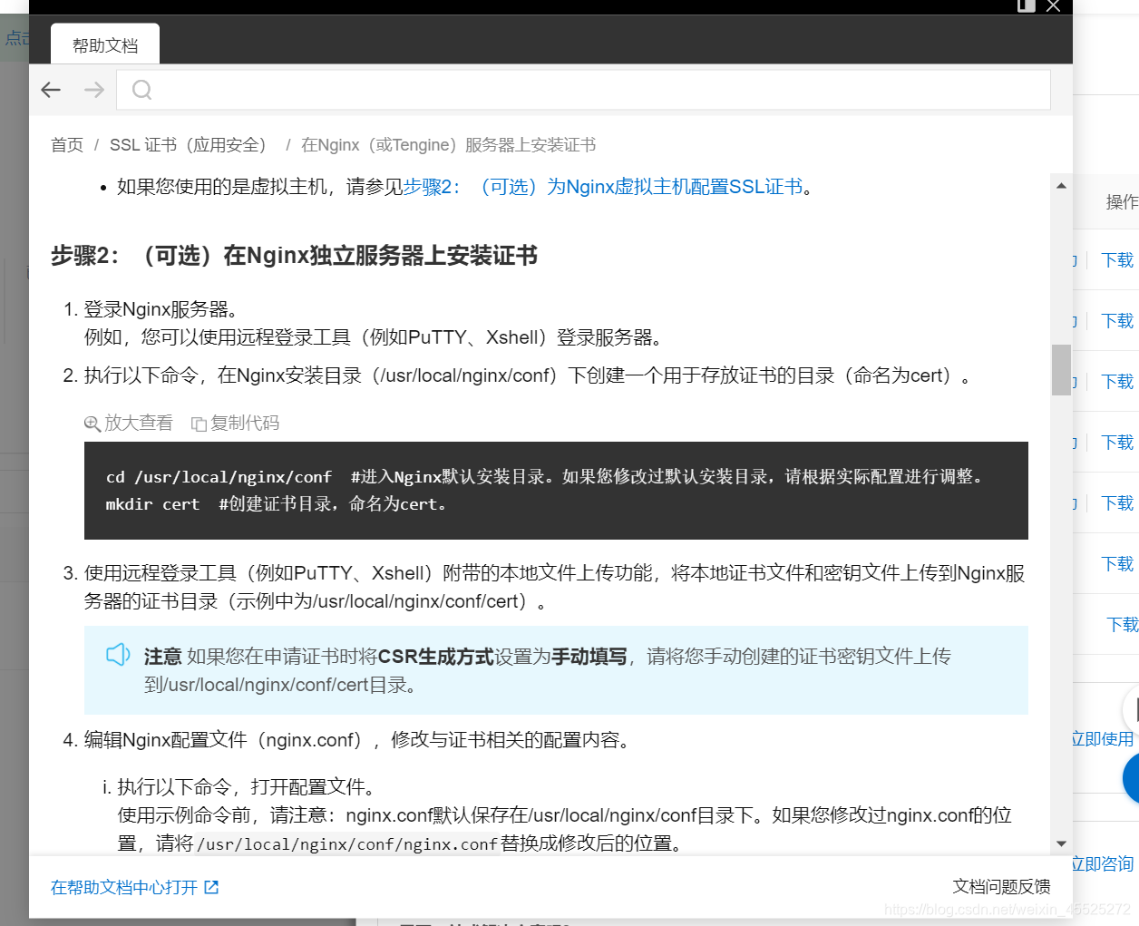 在已获得证书栏中点击下载,并用FTP将得到的两个文件传送到/usr/local/nginx/conf/cert中