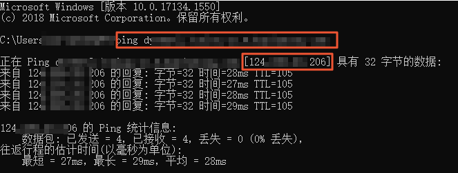 2. 获取CNAME对应的IP地址。(注意:以下通过ping命令得到的IP地址仅作为参考,实际以ping您的真实CNAME地址得到的IP地址为准。)