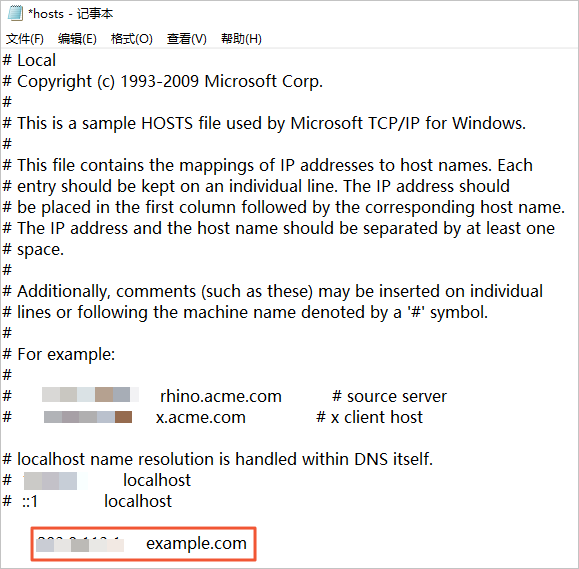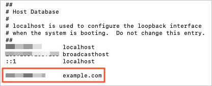 2. 您需要将步骤2得到的IP地址和加速域名绑定到电脑本地hosts文件中,绑定顺序为IP地址在前,加速域名在后,顺序不能颠倒。