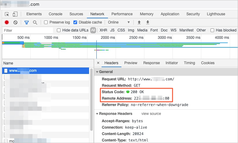 - 如果Remote Address后的IP和您在hosts文件中绑定的IP不一致,表示配置不正确,您需要检查hosts文件中绑定的IP地址是否正确,确保该IP地址是CNAME地址的IP。