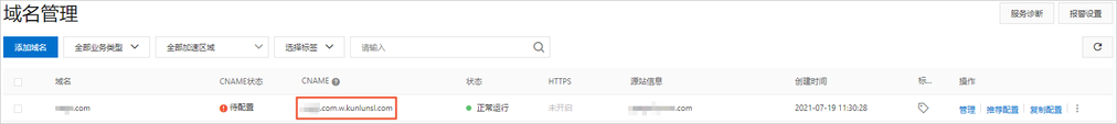 1. 前往阿里云CDN控制台的域名管理列表,复制加速域名对应的CNAME记录值。