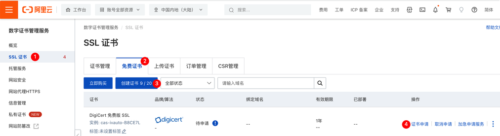 b. 选择 免费证书 - 创建证书 - 证书申请,适用于安全等级要求一般的用户。