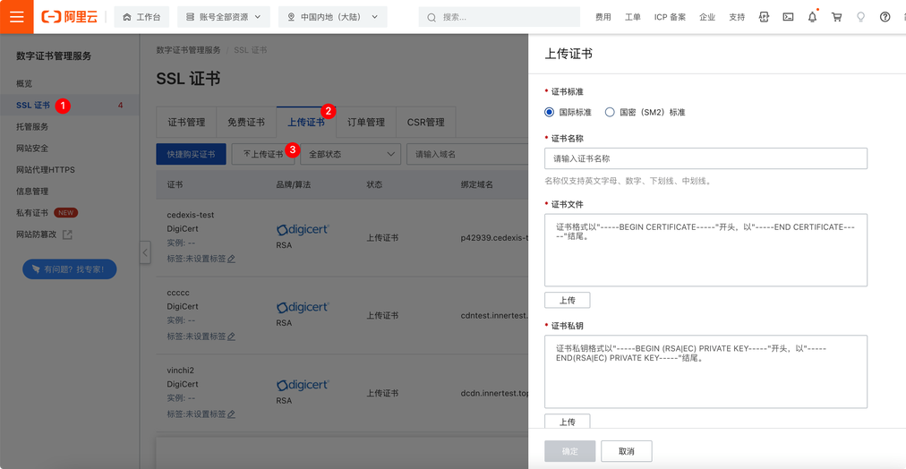 常规情况下,您购买的证书为国际标准证书,上传时选择国际标准即可,证书名称自定义填写,仅用于在平台上管理区分。我们需要将刚刚导出的公私钥文件上传到阿里云平台,例如:
