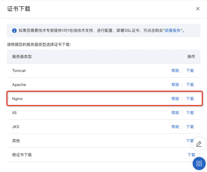 您需要登录外部证书后台,针对需要导出的域名进行证书下载,从第三方平台导出证书到本地时,可以指定服务器类型,推荐您选择 Nginx 类型 的证书文件下载以便于您后续上传证书。