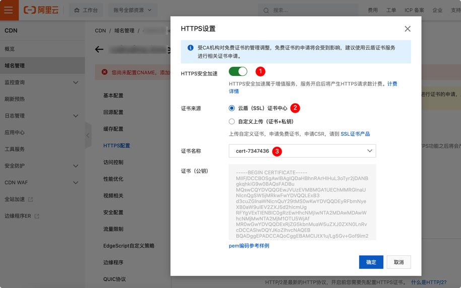 证书上传完成/购买完成后,我们打开CDN控制台的HTTPS配置页面,开启HTTPS安全加速功能后,证书来源选择云盾(SSL)证书中心,点击确定后即可开启,操作示意图如下: