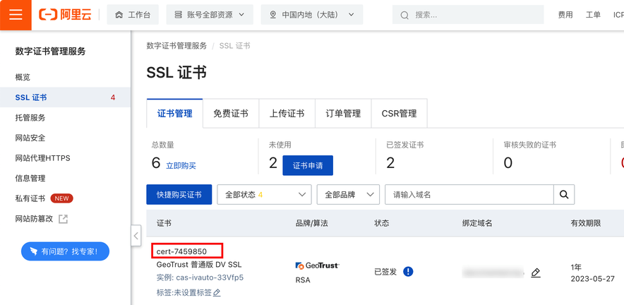2.登录您已购买SSL域名证书的厂商控制台,如未购买,推荐通过 阿里云控制台 - SSL证书(应用安全)申请购买。