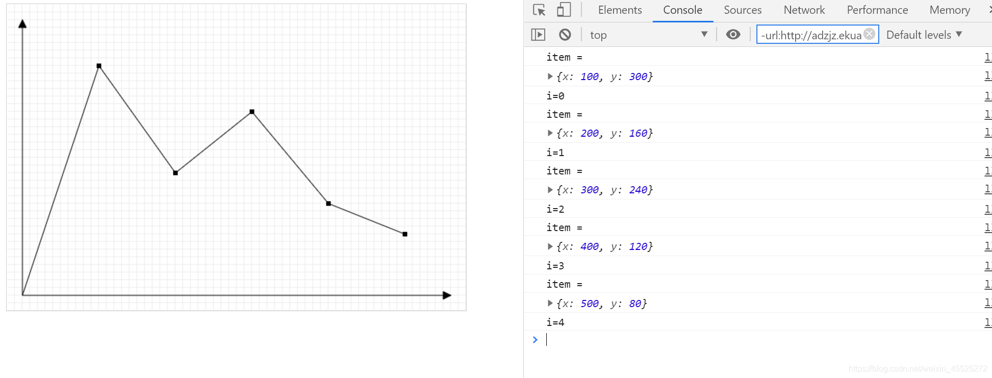 <!DOCTYPE html> <html lang="en"> <head> <meta charset="UTF-8"> <title>折线图</title> <style> canvas { border: 1px solid #ccc; } </style> </head> <body> <canvas width="600" height="400"></canvas> <script> /*1.构造函数*/ var LineChart = function (ctx) { /*获取绘图工具*/ this.ctx = ctx || document.querySelector('canvas').getContext('2d'); /*画布的大小*/ this.canvasWidth = this.ctx.canvas.width; this.canvasHeight = this.ctx.canvas.height; /*网格的大小*/ this.gridSize = 10; /*坐标系的间距*/ this.space = 20; /*坐标原点*/ this.x0 = this.space; this.y0 = this.canvasHeight - this.space; /*箭头的大小*/ this.arrowSize = 10; /*绘制点*/ this.dottedSize = 6; /*点的坐标 和数据有关系 数据可视化*/ } /*2.行为方法*/ LineChart.prototype.init = function (data) { this.drawGrid(); this.drawAxis(); this.drawDotted(data); }; /*绘制网格*/ LineChart.prototype.drawGrid = function () { /*x方向的线*/ var xLineTotal = Math.floor(this.canvasHeight / this.gridSize); this.ctx.strokeStyle = '#eee'; for (var i = 0; i <= xLineTotal; i++) { this.ctx.beginPath(); this.ctx.moveTo(0, i * this.gridSize - 0.5); this.ctx.lineTo(this.canvasWidth, i * this.gridSize - 0.5); this.ctx.stroke(); } /*y方向的线*/ var yLineTotal = Math.floor(this.canvasWidth / this.gridSize); for (var i = 0; i <= yLineTotal; i++) { this.ctx.beginPath(); this.ctx.moveTo(i * this.gridSize - 0.5, 0); this.ctx.lineTo(i * this.gridSize - 0.5, this.canvasHeight); this.ctx.stroke(); } }; /*绘制坐标系*/ LineChart.prototype.drawAxis = function () { /*X轴*/ this.ctx.beginPath(); this.ctx.strokeStyle = '#000'; this.ctx.moveTo(this.x0, this.y0); this.ctx.lineTo(this.canvasWidth - this.space, this.y0); this.ctx.lineTo(this.canvasWidth - this.space - this.arrowSize, this.y0 + this.arrowSize / 2); this.ctx.lineTo(this.canvasWidth - this.space - this.arrowSize, this.y0 - this.arrowSize / 2); this.ctx.lineTo(this.canvasWidth - this.space, this.y0); this.ctx.stroke(); this.ctx.fill(); /*Y轴*/ this.ctx.beginPath(); this.ctx.strokeStyle = '#000'; this.ctx.moveTo(this.x0, this.y0); this.ctx.lineTo(this.space, this.space); this.ctx.lineTo(this.space + this.arrowSize / 2, this.space + this.arrowSize); this.ctx.lineTo(this.space - this.arrowSize / 2, this.space + this.arrowSize); this.ctx.lineTo(this.space, this.space); this.ctx.stroke(); this.ctx.fill(); }; /*绘制所有点*/ LineChart.prototype.drawDotted = function (data) { /*1.数据的坐标 需要转换 canvas坐标*/ /*2.再进行点的绘制*/ /*3.把线连起来*/ var that = this; /*记录当前坐标*/ var prevCanvasX = 0; var prevCanvasY = 0; data.forEach(function (item, i) { /* x = 原点的坐标 + 数据的坐标 */ /* y = 原点的坐标 - 数据的坐标 */ console.log("item ="); console.log(item); console.log( "i="+i); var canvasX = that.x0 + item.x; var canvasY = that.y0 - item.y; /*绘制点*/ that.ctx.beginPath(); that.ctx.moveTo(canvasX - that.dottedSize / 2, canvasY - that.dottedSize / 2); that.ctx.lineTo(canvasX + that.dottedSize / 2, canvasY - that.dottedSize / 2); that.ctx.lineTo(canvasX + that.dottedSize / 2, canvasY + that.dottedSize / 2); that.ctx.lineTo(canvasX - that.dottedSize / 2, canvasY + that.dottedSize / 2); that.ctx.closePath(); that.ctx.fill(); /*点的连线*/ /*当时第一个点的时候 起点是 x0 y0*/ /*当时不是第一个点的时候 起点是 上一个点*/ if(i == 0){ that.ctx.beginPath(); that.ctx.moveTo(that.x0,that.y0); that.ctx.lineTo(canvasX,canvasY); that.ctx.stroke(); }else{ /*上一个点*/ that.ctx.beginPath(); that.ctx.moveTo(prevCanvasX,prevCanvasY); that.ctx.lineTo(canvasX,canvasY); that.ctx.stroke(); } /*记录当前的坐标,下一次要用*/ prevCanvasX = canvasX; prevCanvasY = canvasY; }); }; /*3.初始化*/ var data = [ { x: 100, y: 300 }, { x: 200, y: 160 }, { x: 300, y: 240 }, { x: 400, y: 120 }, { x: 500, y: 80 } ]; var lineChart = new LineChart(); lineChart.init(data); </script> </body> </html>