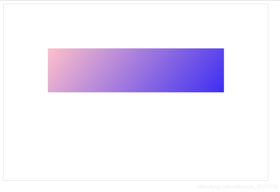 <!DOCTYPE html> <html lang="en"> <head> <meta charset="UTF-8"> <title>Title</title> <style> canvas { border: 1px solid #ccc; } /* .linearGradient{ width: 400px; height: 100px; background-image: linear-gradient(to right,pink,blue); }*/ </style> </head> <body> <div class="linearGradient"></div> <canvas width="600" height="400"></canvas> <script> var myCanvas = document.querySelector('canvas'); var ctx = myCanvas.getContext('2d'); /*fillStyle 'pink' '#000' 'rgb()' 'rgba()' */ /*也可以使用一个渐变的方案了填充矩形*/ /*创建一个渐变的方案*/ /*渐变是由长度的*/ /*x0y0 起始点 x1y1 结束点 确定长度和方向*/ var linearGradient = ctx.createLinearGradient(100,100,500,400); linearGradient.addColorStop(0,'pink'); //linearGradient.addColorStop(0.5,'red'); linearGradient.addColorStop(1,'blue'); ctx.fillStyle = linearGradient; ctx.fillRect(100,100,400,100); /*pink---->blue*/ /*回想线性渐变---->要素 方向 起始颜色 结束颜色 */ /*通过两个点的坐标可以控制 渐变方向*/ </script> </body> </html>