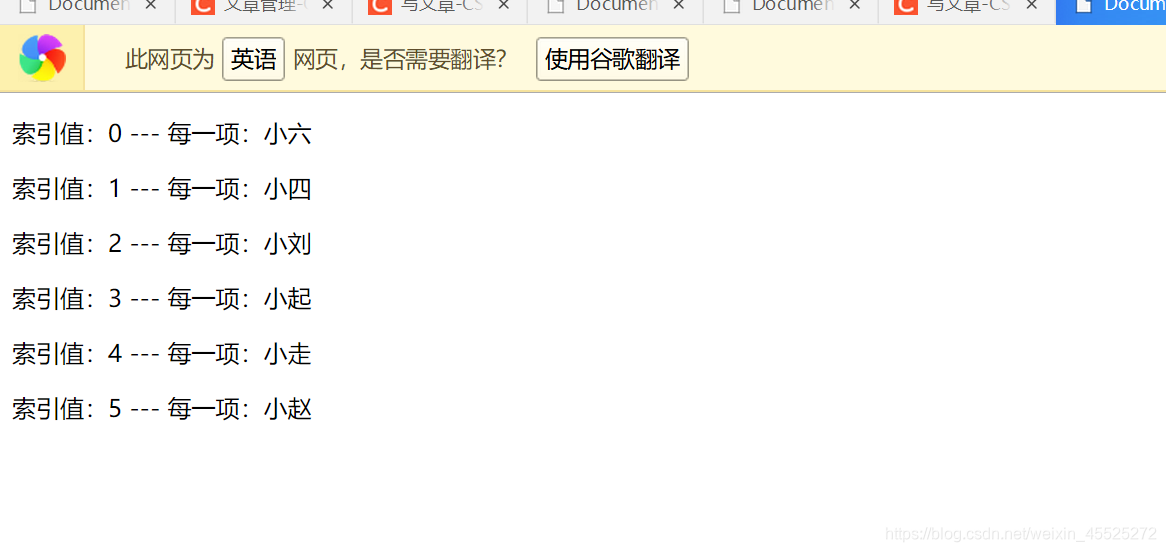 <!DOCTYPE html> <html lang="en"> <head> <meta charset="UTF-8"> <meta name="viewport" content="width=device-width, initial-scale=1.0"> <meta http-equiv="X-UA-Compatible" content="ie=edge"> <title>Document</title> <script src="./lib/vue-2.4.0.js"></script> </head> <body> <div id="app"> <!-- <p>{{list[0]}}</p> <p>{{list[1]}}</p> <p>{{list[2]}}</p> <p>{{list[3]}}</p> <p>{{list[4]}}</p> --> <p v-for="(item, i) in list">索引值:{{i}} --- 每一项:{{item}}</p> </div> <script> // 创建 Vue 实例,得到 ViewModel var vm = new Vue({ el: '#app', data: { list: ['小六', '小四', '小刘', '小起', '小走', '小赵'] }, methods: {} }); </script> </body> </html>