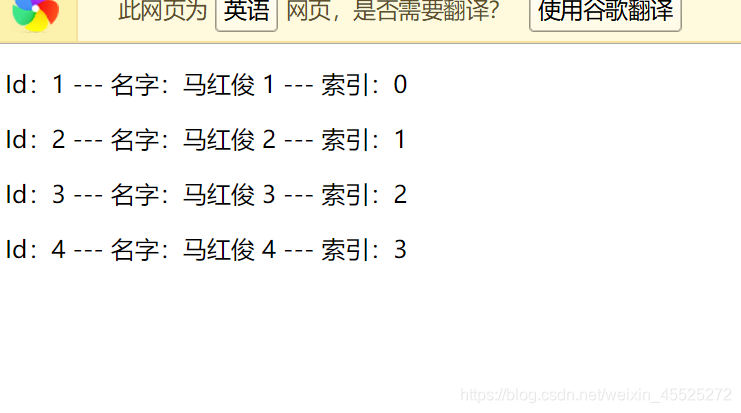 <!DOCTYPE html> <html lang="en"> <head> <meta charset="UTF-8"> <meta name="viewport" content="width=device-width, initial-scale=1.0"> <meta http-equiv="X-UA-Compatible" content="ie=edge"> <title>Document</title> <script src="./lib/vue-2.4.0.js"></script> </head> <body> <div id="app"> <p v-for="(user, i) in list">Id:{{ user.id }} --- 名字:{{ user.name }} --- 索引:{{i}}</p> </div> <script> // 创建 Vue 实例,得到 ViewModel var vm = new Vue({ el: '#app', data: { list: [ { id: 1, name: '马红俊 1' }, { id: 2, name: '马红俊 2' }, { id: 3, name: '马红俊 3' }, { id: 4, name: '马红俊 4' } ] }, methods: {} }); </script> </body> </html>