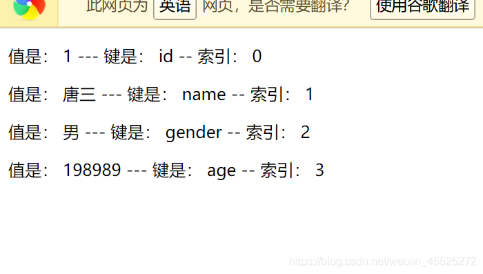 <!DOCTYPE html> <html lang="en"> <head> <meta charset="UTF-8"> <meta name="viewport" content="width=device-width, initial-scale=1.0"> <meta http-equiv="X-UA-Compatible" content="ie=edge"> <title>Document</title> <script src="./lib/vue-2.4.0.js"></script> </head> <body> <div id="app"> <!-- 注意:在遍历对象身上的键值对的时候, 除了 有 val key ,在第三个位置还有 一个 索引 --> <p v-for="(val, key, i) in user">值是: {{ val }} --- 键是: {{key}} -- 索引: {{i}}</p> </div> <script> // 创建 Vue 实例,得到 ViewModel var vm = new Vue({ el: '#app', data: { user: { id: 1, name: '唐三', gender: '男', age:198989 } }, methods: {} }); </script> </body> </html>