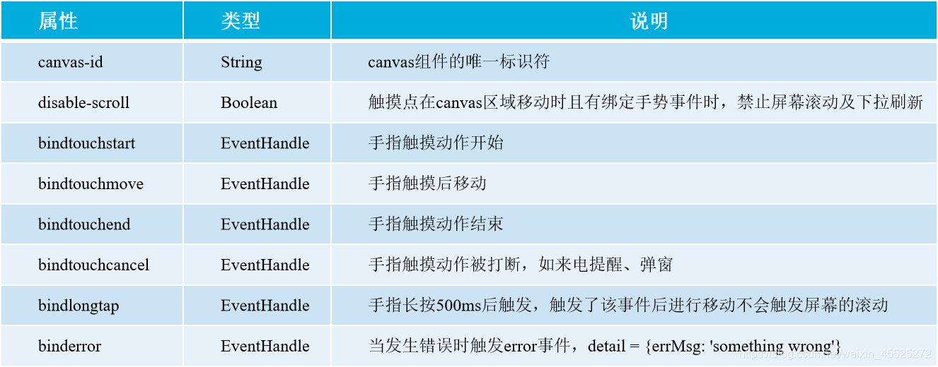 CanvasContext.draw ():将之前在绘图上下文中的描述(路径、样式、变形)画到canvas中。 CanvasContext.arc():创建一条弧线。 CanvasContext.rect():创建一个矩形路径。 CanvasContext.lineTo():新增一个新点,用stroke方法来画线条。 CanvasContext.moveTo():把路径移动到画布中的指定点,不创建线条。
