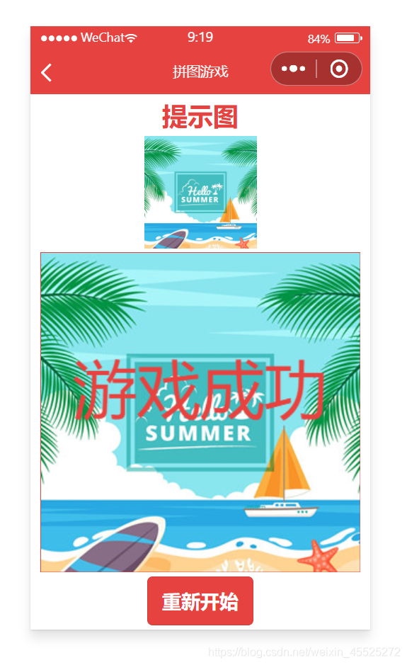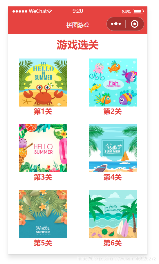 //index.js Page({ /** * 页面的初始数据 */ data: { levels: [ 'pic01.jpg', 'pic02.jpg', 'pic03.jpg', 'pic04.jpg', 'pic05.jpg', 'pic06.jpg' ] }, /** * 自定义函数--游戏选关 */ chooseLevel: function(e) { // console.log(e.currentTarget.dataset.level) // 获取选关图片 let level = e.currentTarget.dataset.level // 跳转游戏页面 wx.navigateTo({ url: '../game/game?level='+level, }) }, })
