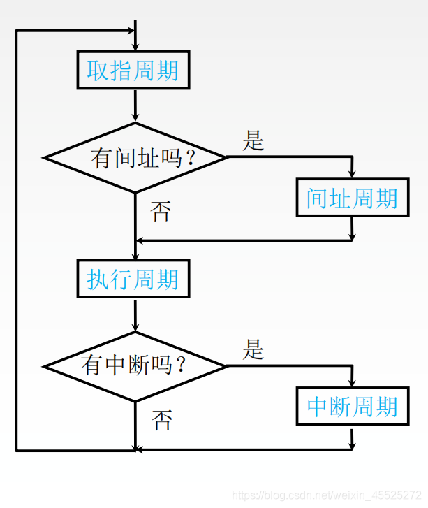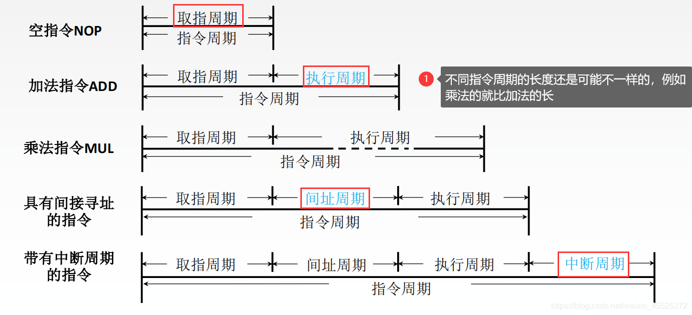 指令周期:CPU从主存中每取出并执行一条指令所需的全部时间。