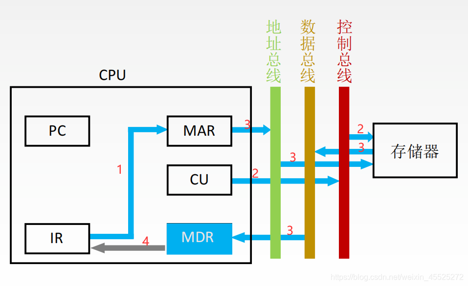 - 将MAR所指主存中的内容经数据总线送入MDR,记做:M(MAR) → MDR