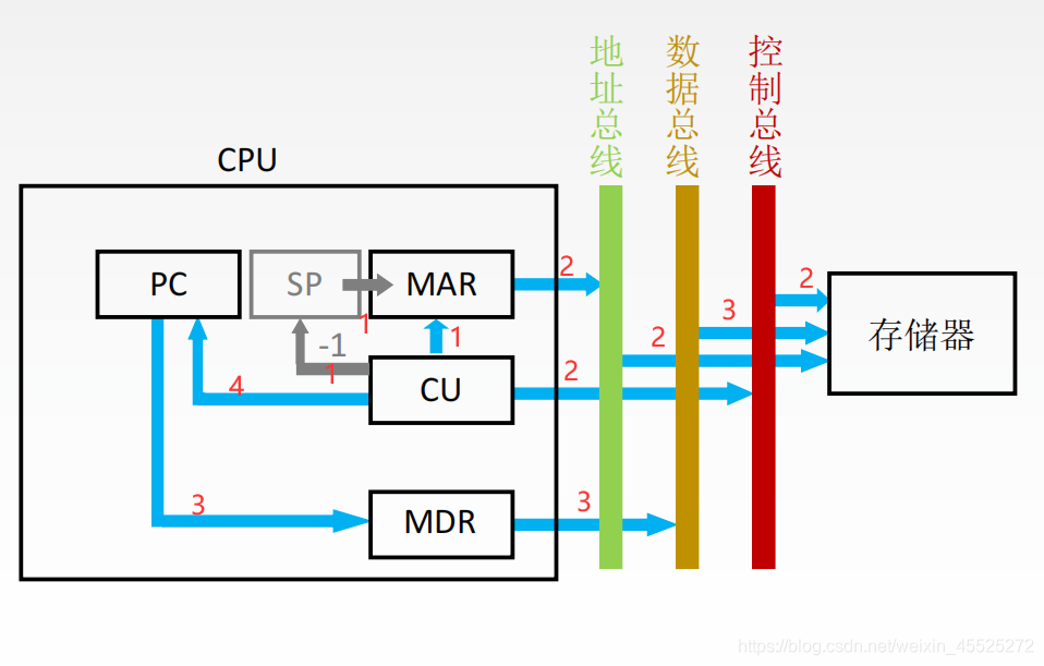 - CU控制将SP减1,修改后的地址送入MAR记做: (SP)-1 → SP,(SP) → MAR