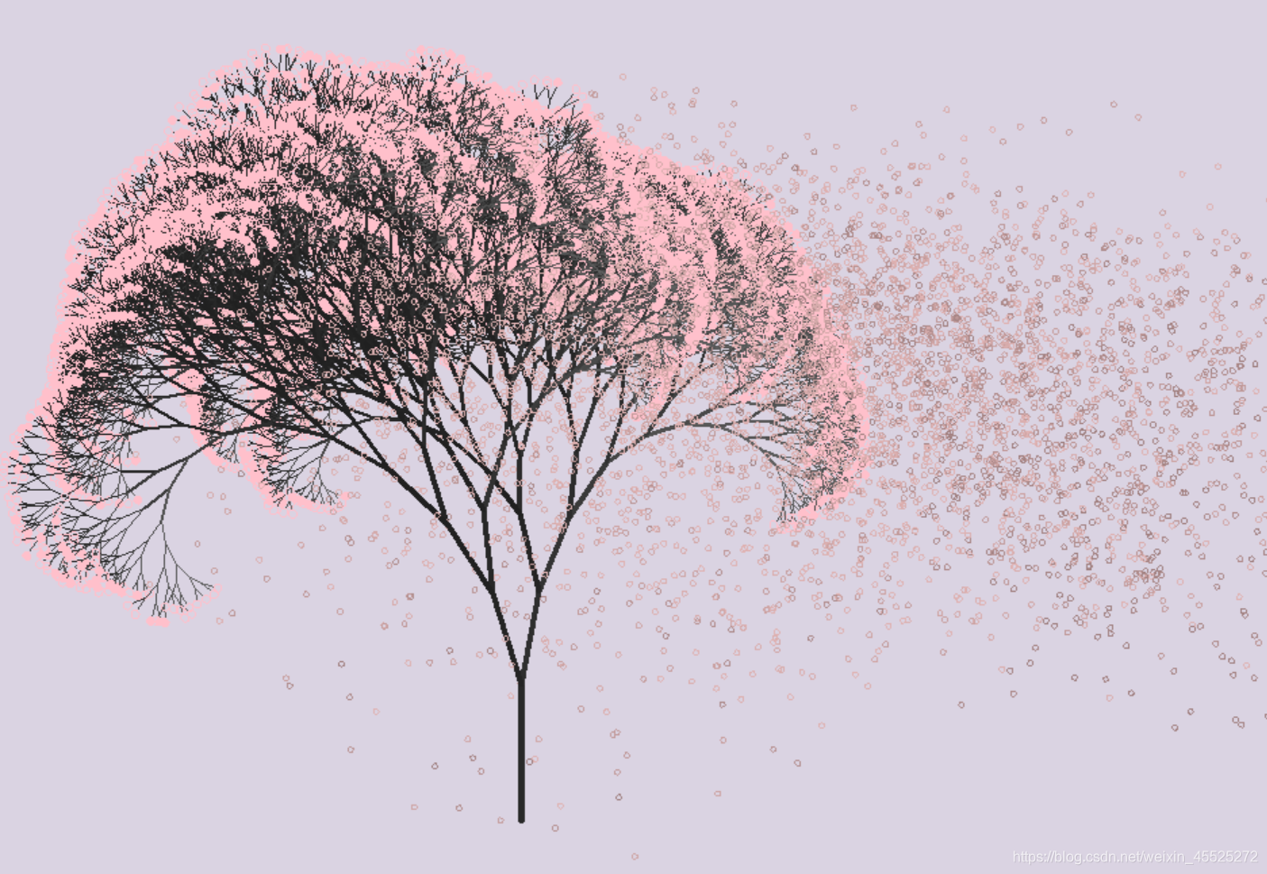 from turtle import * from random import * from math import * def tree(n,l): pd()#下笔 #阴影效果 t = cos(radians(heading()+45))/8+0.25 pencolor(t,t,t) pensize(n/3) forward(l)#画树枝 if n>0: b = random()*15+10 #右分支偏转角度 c = random()*15+10 #左分支偏转角度 d = l*(random()*0.25+0.7) #下一个分支的长度 #右转一定角度,画右分支 right(b) tree(n-1,d) #左转一定角度,画左分支 left(b+c) tree(n-1,d) #转回来 right(c) else: #画叶子 right(90) n=cos(radians(heading()-45))/4+0.5 ran=random() #这里相比于原来随机添加了填充的圆圈,让樱花叶子看起来更多一点 if(ran>0.7): begin_fill() circle(3) fillcolor('pink') #把原来随机生成的叶子换成了统一的粉色 pencolor("pink") circle(3) if(ran>0.7): end_fill() left(90) #添加0.3倍的飘落叶子 if(random()>0.7): pu() #飘落 t = heading() an = -40 +random()*40 setheading(an) dis = int(800*random()*0.5 + 400*random()*0.3 + 200*random()*0.2) forward(dis) setheading(t) #画叶子 pd() right(90) n = cos(radians(heading()-45))/4+0.5 pencolor(n*0.5+0.5,0.4+n*0.4,0.4+n*0.4) circle(2) left(90) pu() #返回 t=heading() setheading(an) backward(dis) setheading(t) pu() backward(l)#退回 if __name__ == '__main__': bgcolor(0.856,0.8255,0.8882)#设置背景色(把灰色换成淡紫色) ht()#隐藏turtle speed(10)#速度 1-10渐进,0 最快 tracer(0,0) pu()#抬笔 backward(50) left(90)#左转90度 pu()#抬笔 backward(300)#后退300 tree(12,100)#递归12层 done()