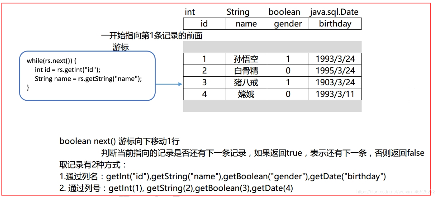 - 如果光标在第一行之前,使用 rs.getXX()获取列值,报错:Before start of result set