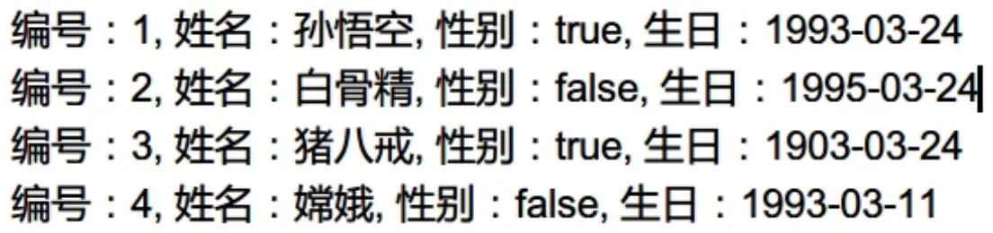 package com.sqltest; import java.sql.*; /** * 查询所有的学生信息*/ public class Demo6DQL { public static void main(String[] args) throws SQLException { //1) 得到连接对象 Connection connection =DriverManager.getConnection("jdbc:mysql://localhost:3306/day24","root","root"); //2) 得到语句对象 Statement statement = connection.createStatement(); //3) 执行 SQL 语句得到结果集 ResultSet 对象 ResultSet rs = statement.executeQuery("select * from student"); //4) 循环遍历取出每一条记录 while(rs.next()) { int id = rs.getInt("id"); String name = rs.getString("name"); boolean gender = rs.getBoolean("gender"); Date birthday = rs.getDate("birthday"); //5) 输出的控制台上 System.out.println("编号:" + id + ", 姓名:" + name + ", 性别:" + gender + ", 生日:" + birthday); } //6) 释放资源 rs.close(); statement.close(); connection.close(); } }