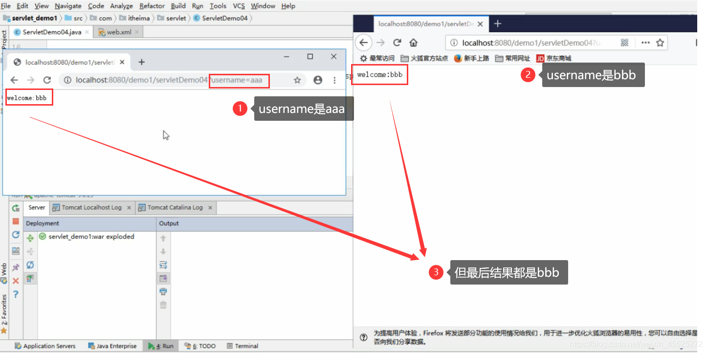 /* Servlet线程安全 */ public class ServletDemo04 extends HttpServlet{ @Override protected void doGet(HttpServletRequest req, HttpServletResponse resp) throws ServletException, IOException { //1.定义用户名成员变量:放在doGet里,作为临时变量 String username = null; // 加上线程同步锁,进一步保护数据 synchronized (this) { //2.获取用户名 username = req.getParameter("username"); try { Thread.sleep(3000); } catch (InterruptedException e) { e.printStackTrace(); } //3.获取输出流对象 PrintWriter pw = resp.getWriter(); //4.响应给客户端浏览器 pw.print("welcome:" + username); //5.关流 pw.close(); } } @Override protected void doPost(HttpServletRequest req, HttpServletResponse resp) throws ServletException, IOException { doGet(req,resp); } }