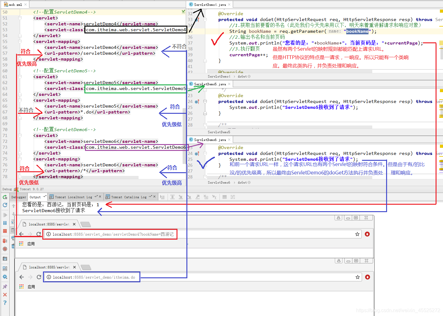 通过测试我们发现,Servlet支持多种配置方式,但是由此也引出了一个问题,当有两个及以上的Servlet映射都符合请求URL时,由谁来响应呢?注意:HTTP协议的特征是一请求一响应的规则。那么有一个请求,必然有且只有一个响应。所以,我们接下来明确一下,多种映射规则的优先级。