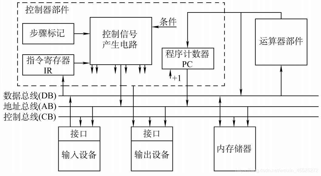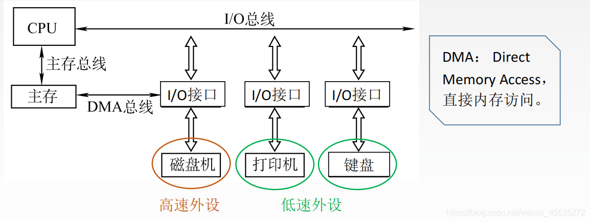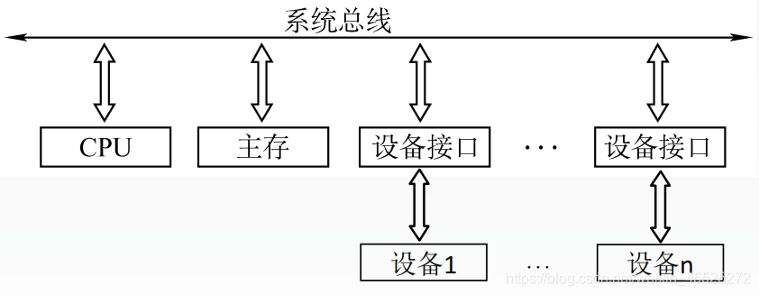 - 结构:CPU、主存、I/O设备(通过I/O接口)都连接在一组总线上,允许I/O设备之间、I/O设备和CPU之间或I/O设备与主存之间直接交换信息。