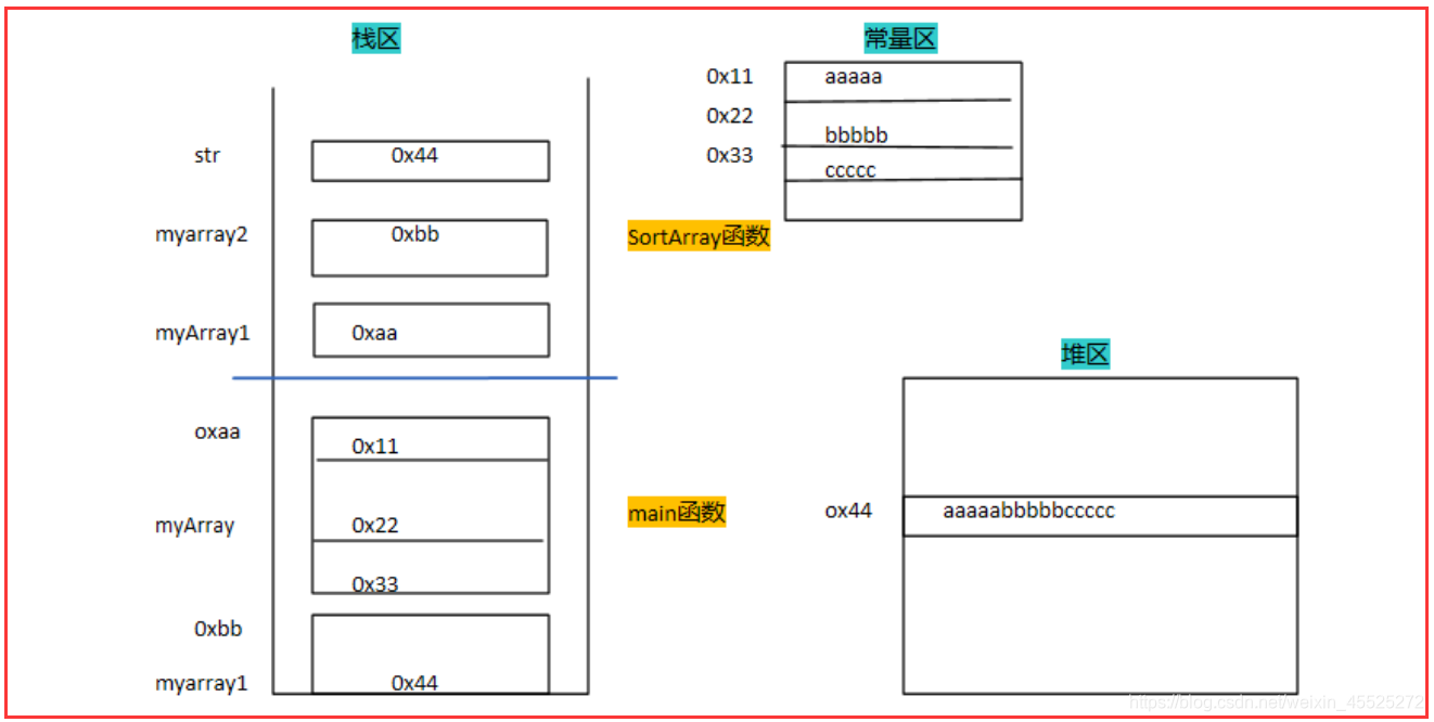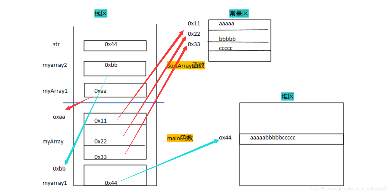 然后在SortArray 函数中参数 myArray1 压栈他存放的是数组 myArray 的地址 0xaa,接着 myarray2 压栈,他存放的地址是 myarray1 的地址 0xbb,最后 str 压栈他存放的是 malloc 出来的空间的地址 0x44,通过 *myarray2 = str(此时的myarray2地址是传进来的myarray1),使得 myarray1存放的地址为 0x44,这时 main 函数中的 myarray1 指针就指向了堆空间中的字符串 aaaaabbbbbccccc 了。