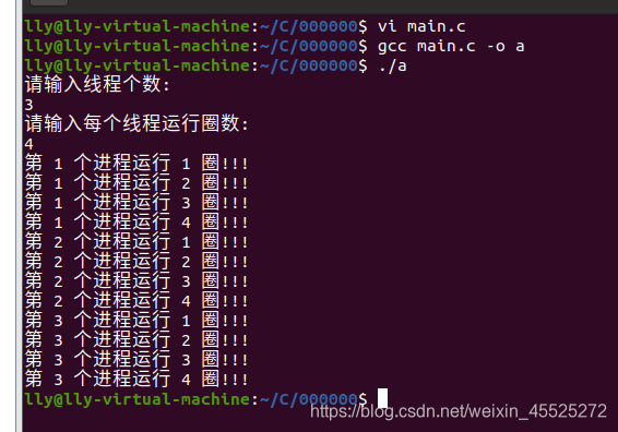 /************************************************************************* > File Name: main.c > Author: 杨永利 > Mail: 1795018360@qq.com > Created Time: 2021年07月14日 星期三 21时22分03秒 ************************************************************************/ #include <unistd.h> #include <sys/wait.h> #include <stdio.h> #include <stdlib.h> int main(int argc, char const *argv[]) { int iProcessNum = 0; int iProcessLoop = 0; pid_t pid; int i = 0, j = 0; printf("请输入线程个数:\n"); scanf("%d", &iProcessNum); printf("请输入每个线程运行圈数:\n"); scanf("%d", &iProcessLoop); // 循环创建多个进程 for (i = 0; i < iProcessNum; i++) { pid = fork(); if (pid > 0) { break; } else if (pid == 0) { for (j = 0; j < iProcessLoop; j++) { printf("第 %d 个进程运行 %d 圈!!!\n", i + 1, j + 1); } } else { perror("fork error"); exit(1); } } wait(NULL); return 0; }