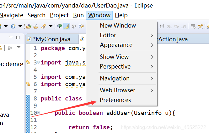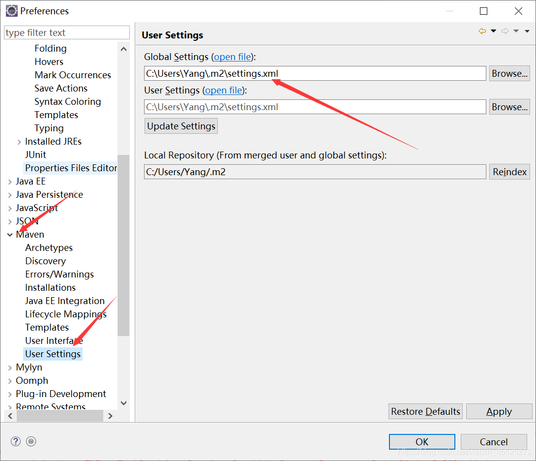 1.打开Eclipse→Window→Preferences,然后在Preferences窗口中找到Maven→UserSettings找到.m2文件的安装目录,