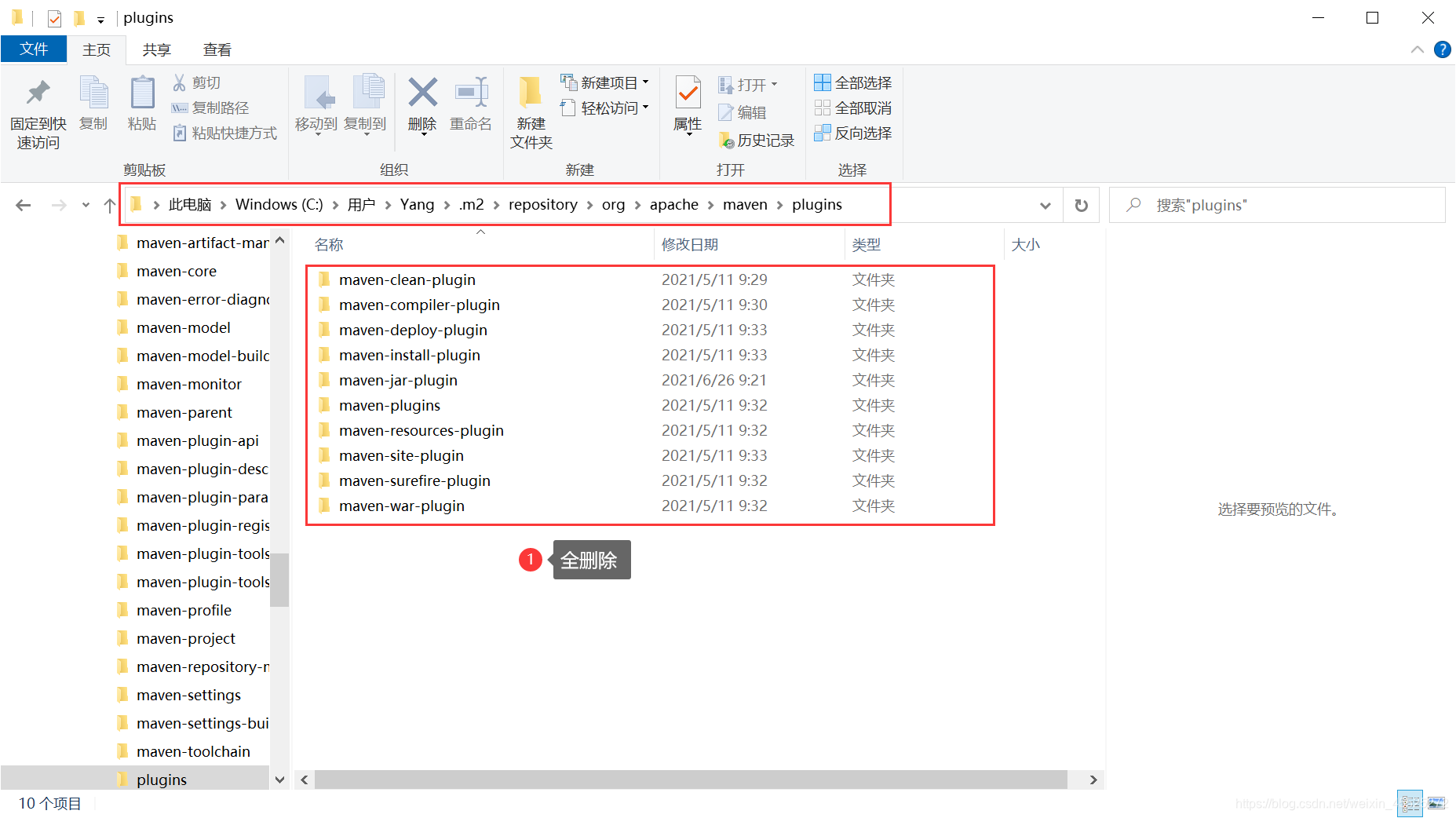 然后将.m2/repository/org/apache/maven/plugins目录下的文件夹全部删除,