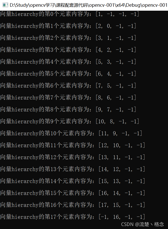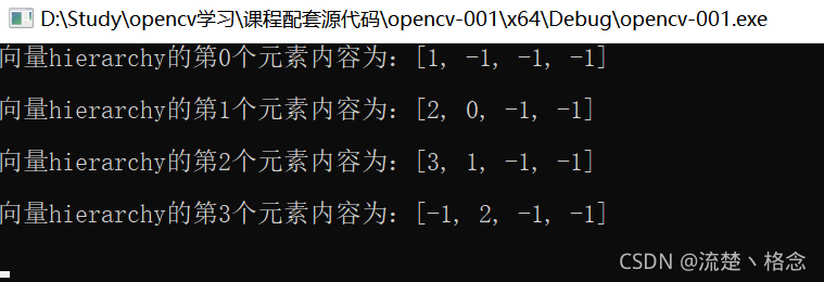 本次参数配置下,hierarchy向量内有3个元素,分别对应于3个轮廓。以第2个轮廓(对应向量内第1个元素)为例,