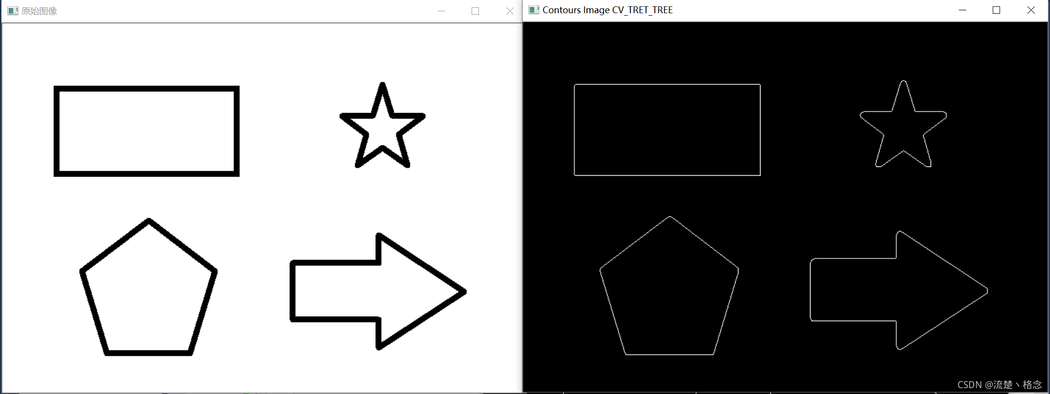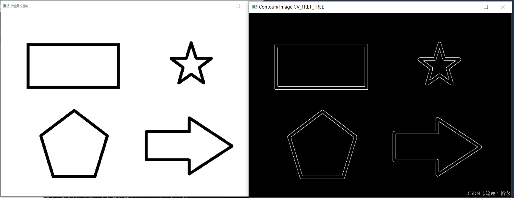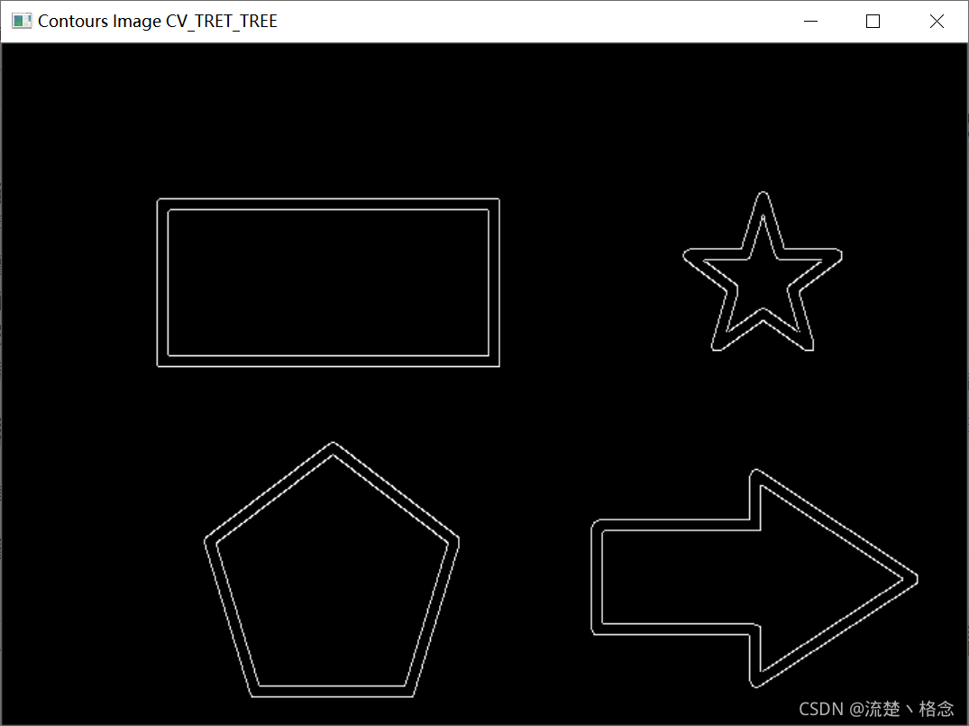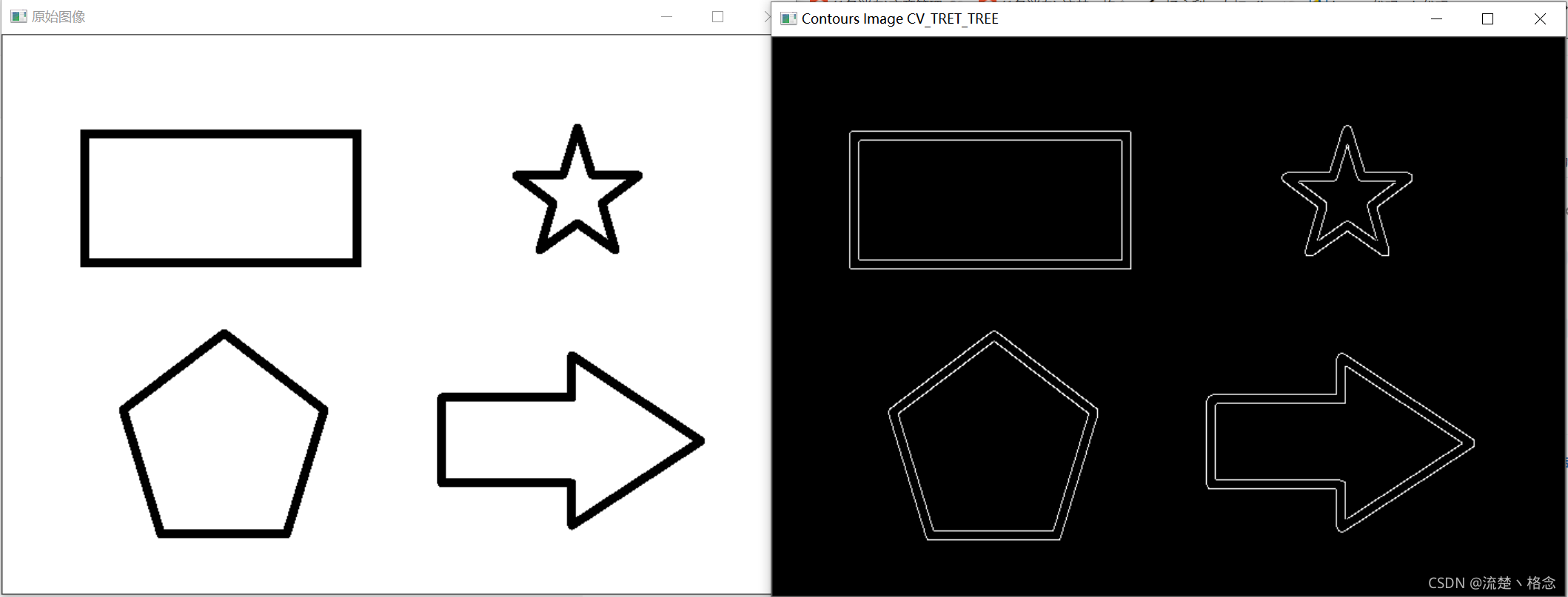 所有内外层轮廓都被检测到,contours点集组成的图形跟轮廓表现一致。