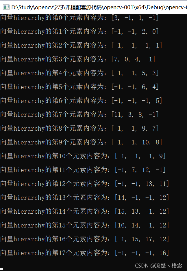 重温一下hierarchy向量————向量中每个元素的4个整形分别对应当前轮廓的后一个轮廓、前一个轮廓、父轮廓、内嵌轮廓的索引编号。